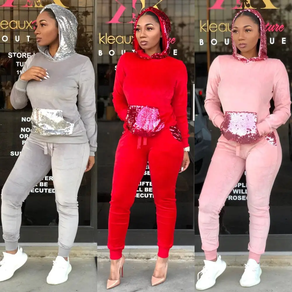 2020 roupas femininas Fashion velour Spring set women 2 pieces Hooded tops and slim pant sweatsuits sequin patchwork tracksuits look the best product that related to